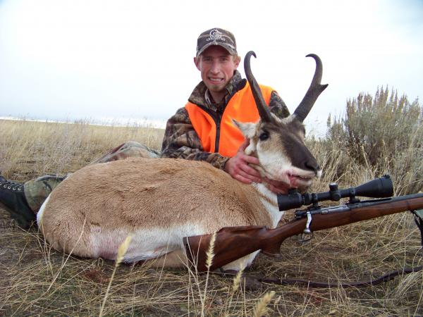 Title: My first goat! And textbook. We say a group from the truck and watched them run up a coulee 3/4 mi away. Stocked out in the rain and made a 315 yd chest shot with my 6.5 mm mag rem. (03-A3)