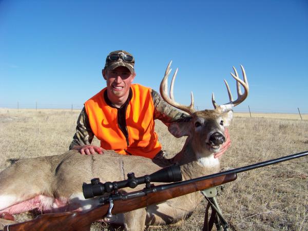 Title: After shooting pheasents, huns, shapies,cottontails, coyotes and my first antilope, the last day brought my nice 5x5 whitetail. First shot was 420 yards; kill shot was 75 yds.