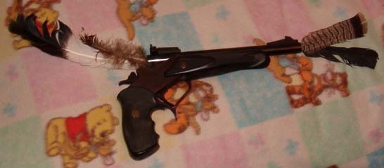 The problem was fowling, not fouling. While I was cleaning her .22, my youngest decorated it with her feather collection. It's probably my favorite all around firearm and has never given me a bit of grief. While it doesn't conceal very well, for target and hunting I'm convinced there is no better nor more versatile platform, except its bigger brother the Encore. I think everyone should have at least one or the other and both if possible. But as far as she's concerned, it's black and ugly and needed some prettying up. But if I put some nice walnut on it, once she shoots it she'll fall in love with it and I'll never see it again. Oh well. She's still a few years from graduation, so I guess I better start saving. Hmmm. Three carbine barrels, walnut stocks and forends for both, whatever handgun barrels she takes a fancy to in the mean time... I'll have to make her a custom case for it all, too... maybe I'll have visitation rights....